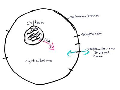 Wat is een virus? Om te kijken naar wat een virus is, wil ik eerst kijken naar de cel. De cel bestaat uit twee elementen, de cel zelf met het membraan er omheen. En dan heb je de celkern (zie tekening). Waarschijnlijk hebben jullie ooit weleens gehoord dat in de celkern onze chromosomen zitten. Op de chromosomen zitten onze genen. Onze genen bestaan uit DNA; dat is onze genetische code. Maar nu wil ik jullie even bewust maken van het feit dat alle cellen in je lichaam hetzelfde DNA, dezelfde genetische code hebben. Toch heb ik huidcellen, oogcellen, hartcellen, levercellen, totaal verschillende soorten cellen. Hoe kan dat? Dat is zo, omdat de genetische code, de genen die we hebben, aan- en uitgezet kunnen worden. Het is afhankelijk van de omgeving van de cel welke genen wel of niet aan staan. Het is heel belangrijk om te weten dat het eigenlijk de omgeving is, die bepaalt wat er gebeurt. Daar zijn een heleboel voorbeelden van te geven, ook qua studies. Maar de epigenetica (de studie van de contextinvloed op de genen) die dit fenomeen bestudeert, heeft in de laatste twintig jaar een hoge vlucht genomen.