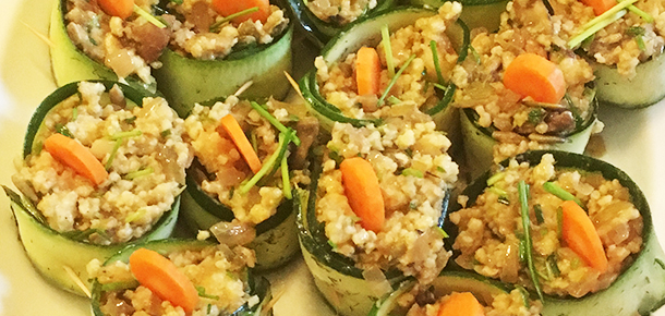 Schaaf de courgette met een kaasschaaf in lange plakken (uit een middelgrote courgette gaan ca. 10 plakken, voor 2 personen heb je aan vier mooie plakken voldoende) Marineer deze plakken 1 tot 2 uur in dressing. Vorm de courgetteplakken tot een ring en steek deze vast met een cocktailprikker. Schep in de courgetteringen steeds 2 eetlepels gierstmix. Garneer met 2-3 sprietjes bieslook. |